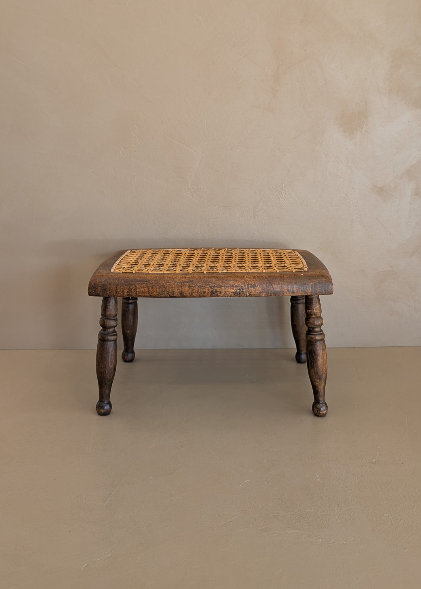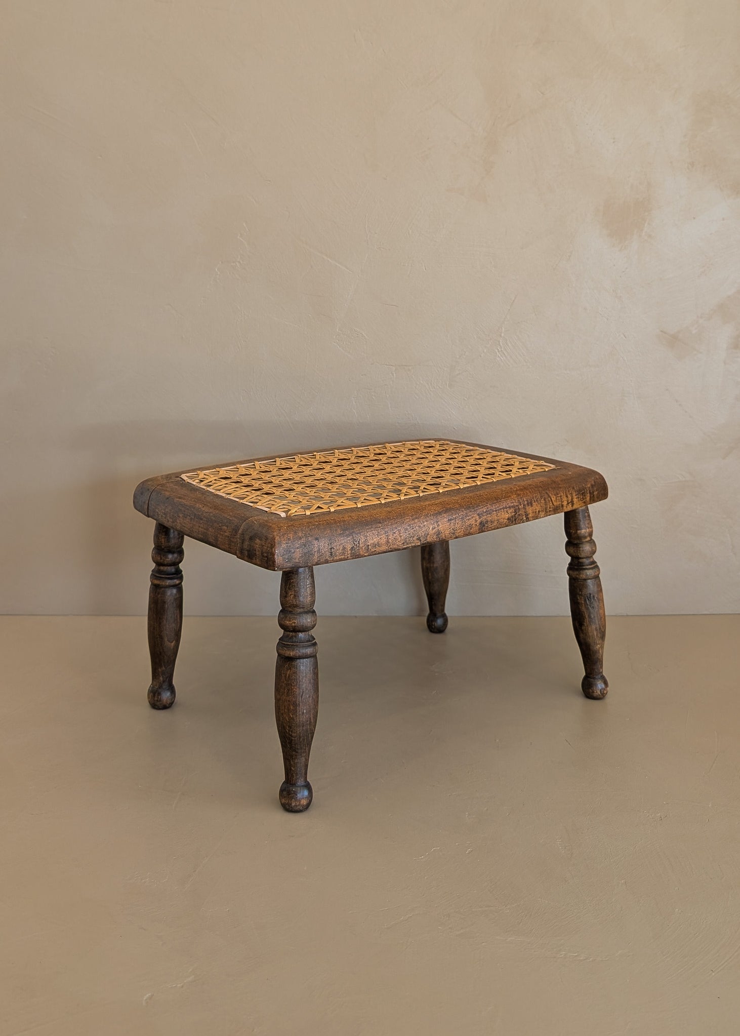 Late 1800s Antique Wooden Footstool With Cane Top