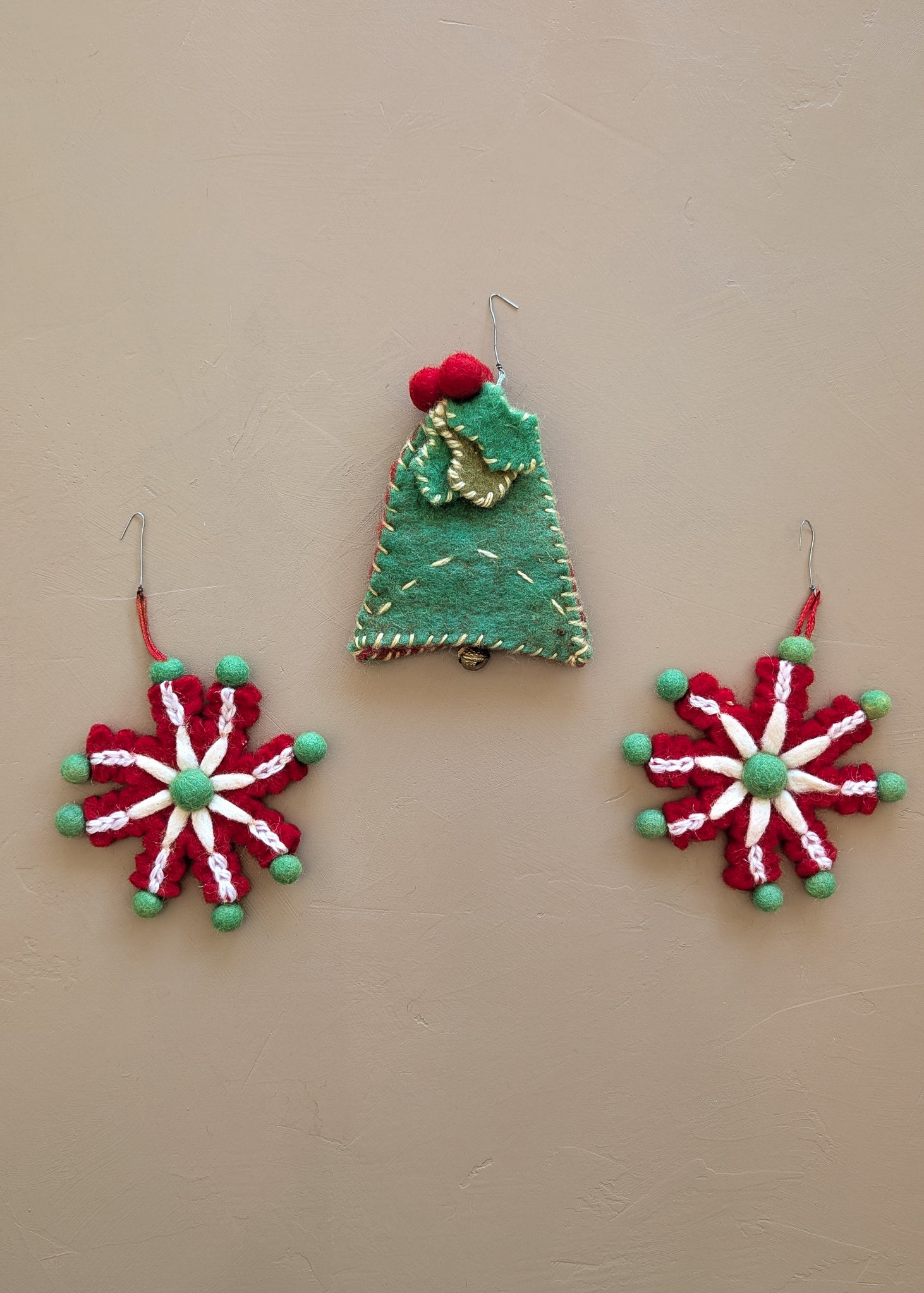 Set of 3 Vintage Felted Wool Snowflakes and Bell Christmas Holiday Ornaments