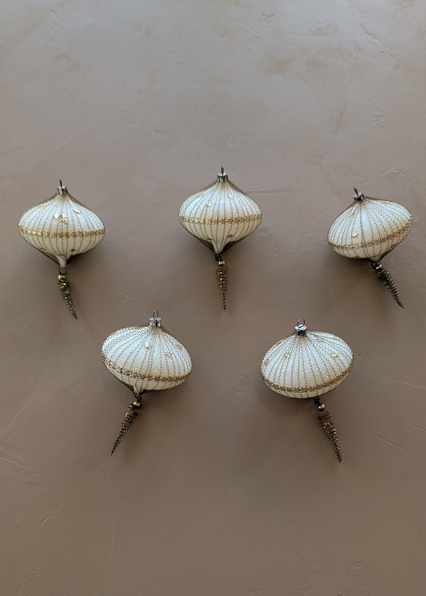 Set of 5 Vintage Midcentury West Germany Mica-Covered Spun Wire Glass Ornaments with Gold Foil Star Detailing