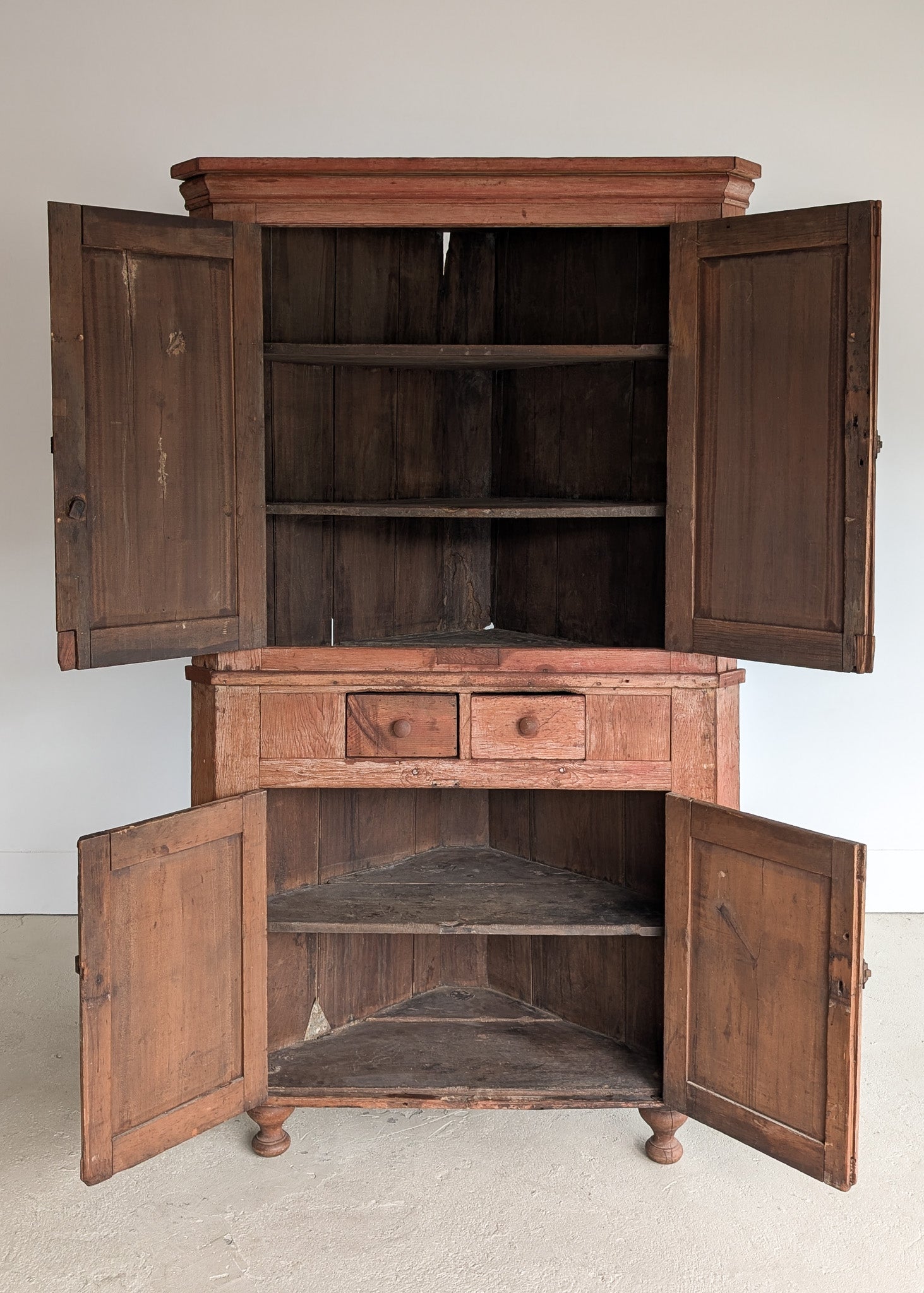 Antique 1790s Late 18th Century Early American Primitive Corner Cupboard with Original Red Milk Paint