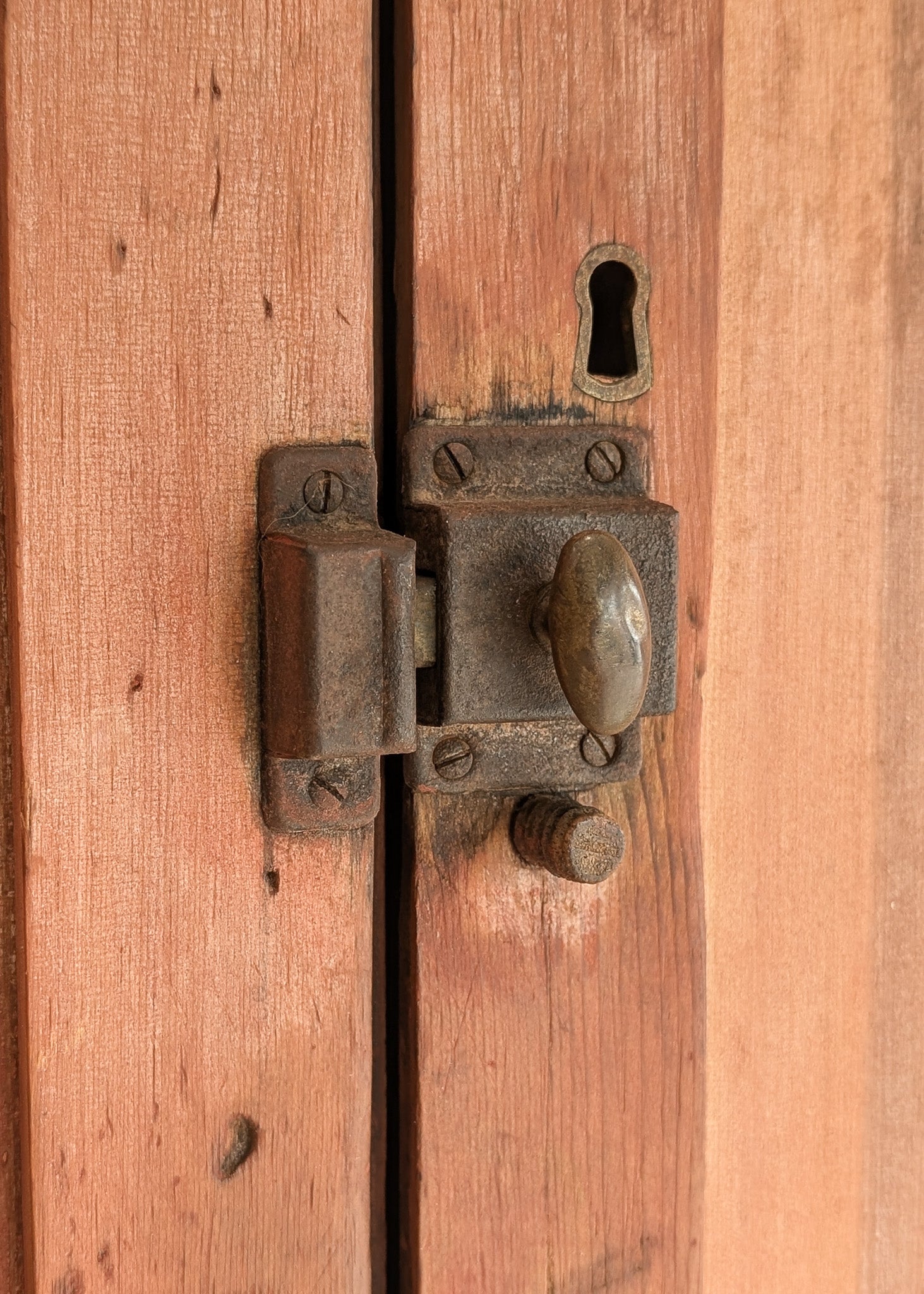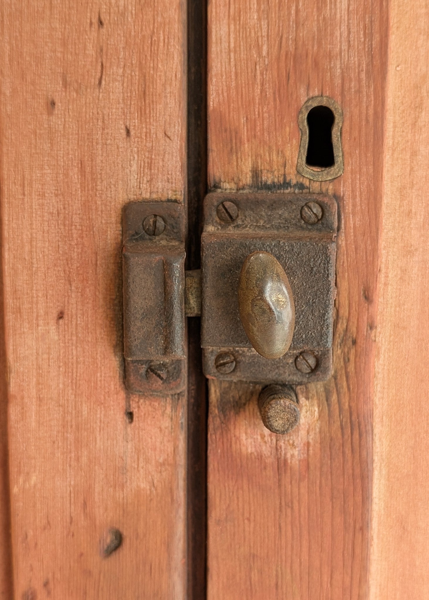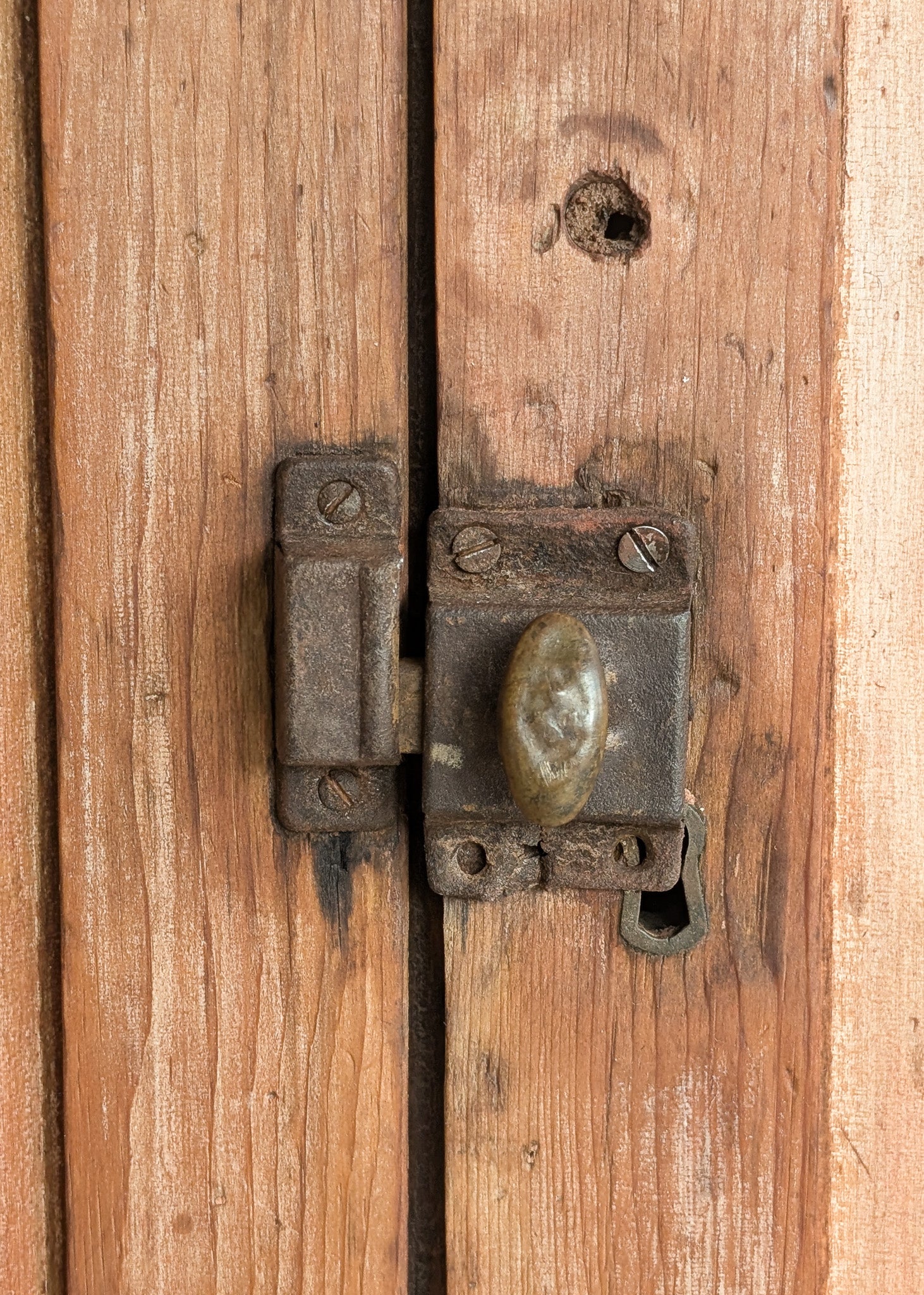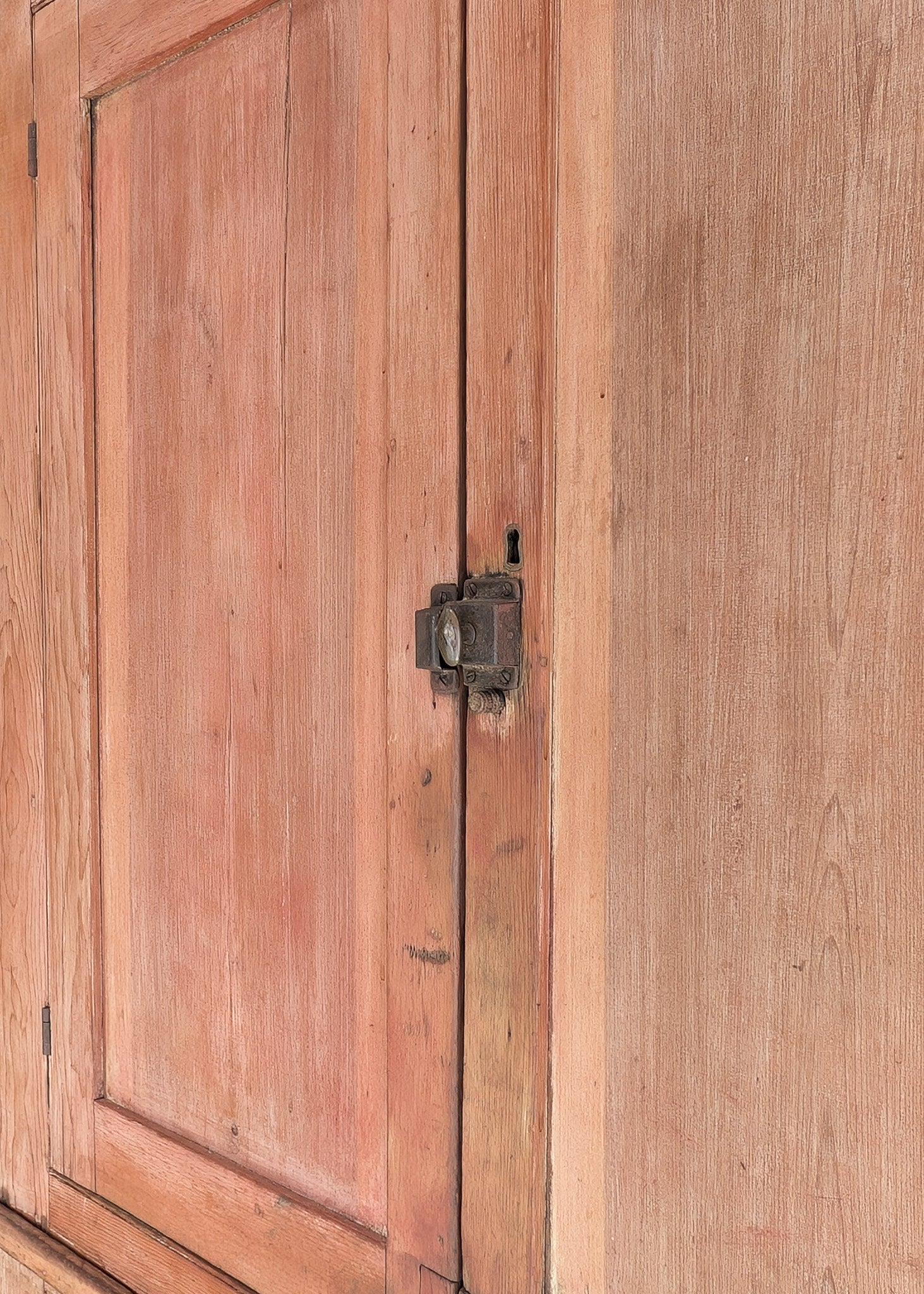 As shown in photos, there is age-appropriate wear throughout. As also detailed in photos, the rails and styles of the cupboard doors have some gaping, which allows for slight adjustability and movement, which we have chosen to keep as is. This adjustability allows for proper fitting of the locks. Once this is in its final home, the rails and styles could be wood glued to the panels to prevent any further movement or left as is.