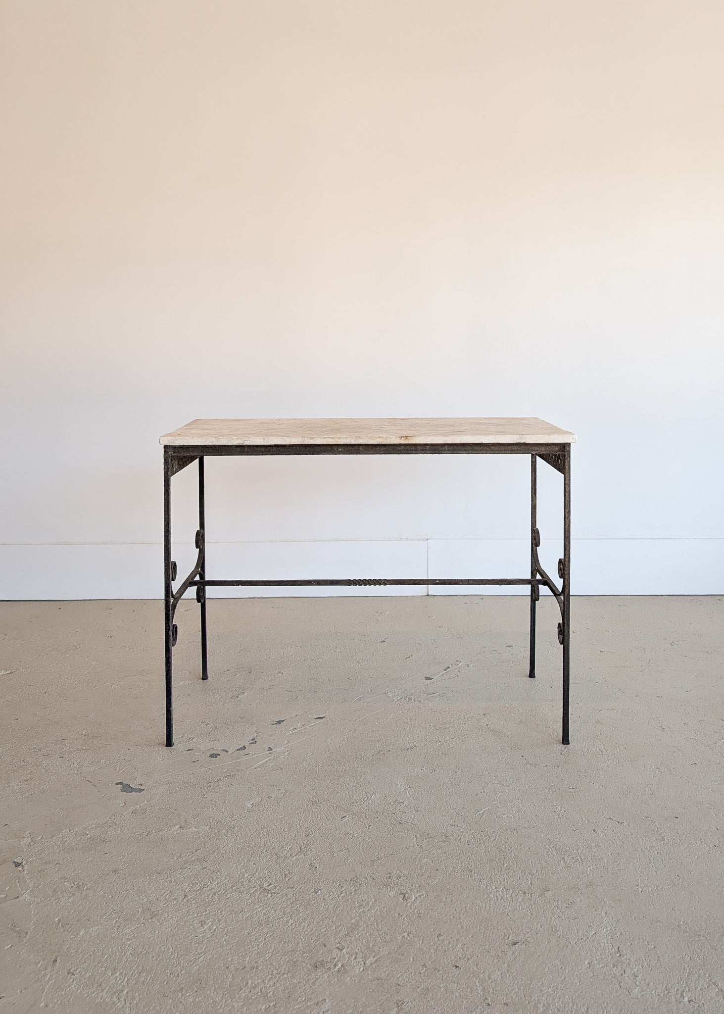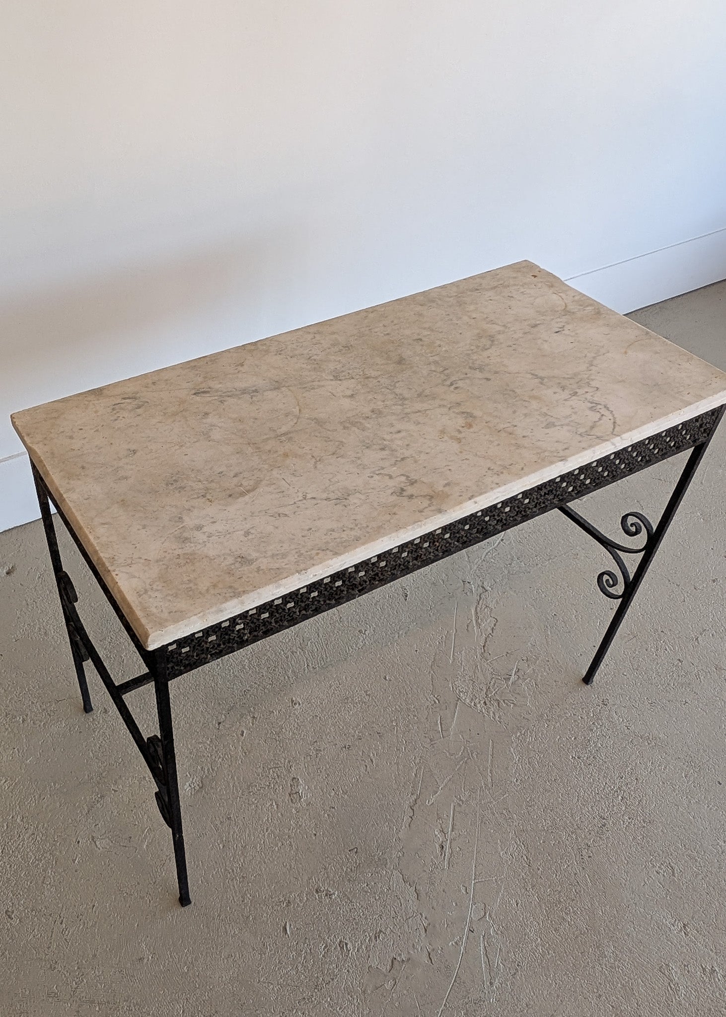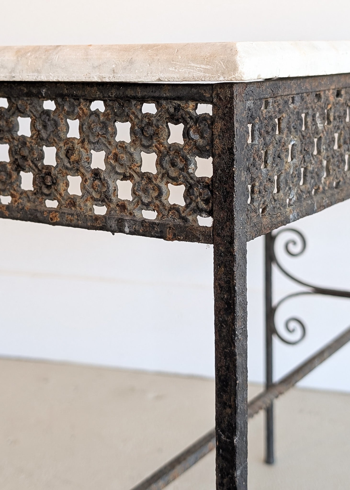 Antique French Marble-Top Console Table with Wrought Iron Base and Quatrefoil Apron and Scroll Detailing