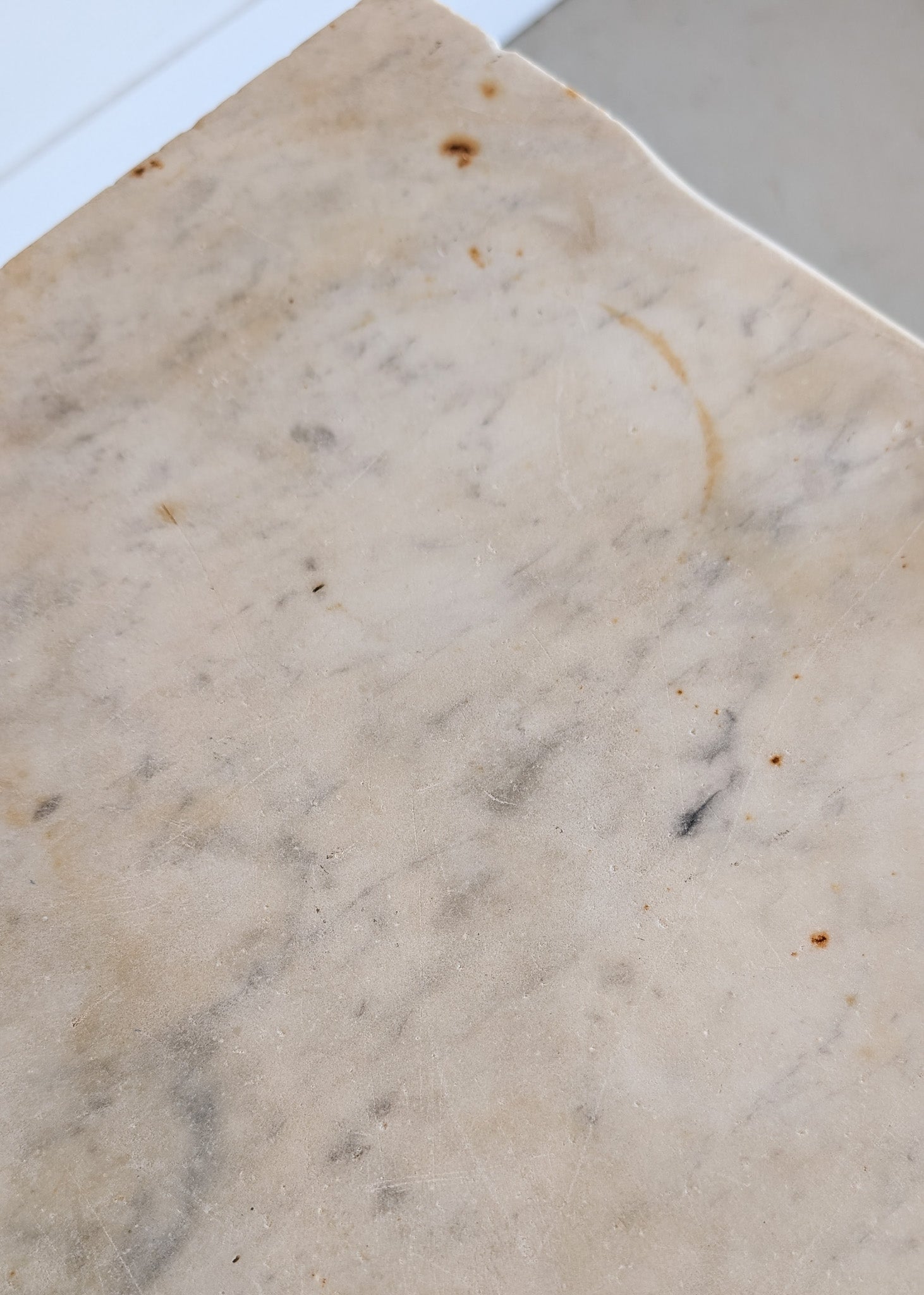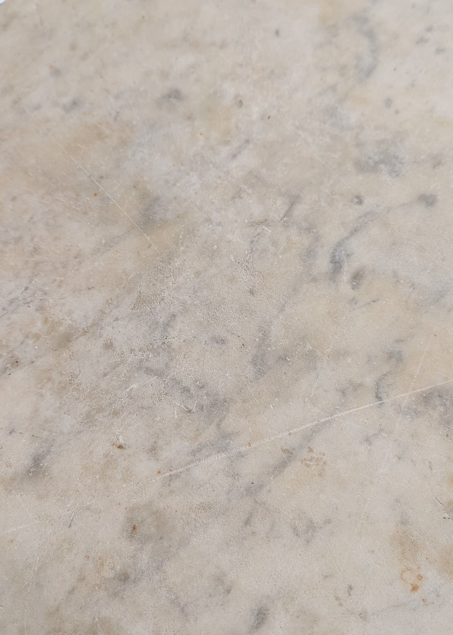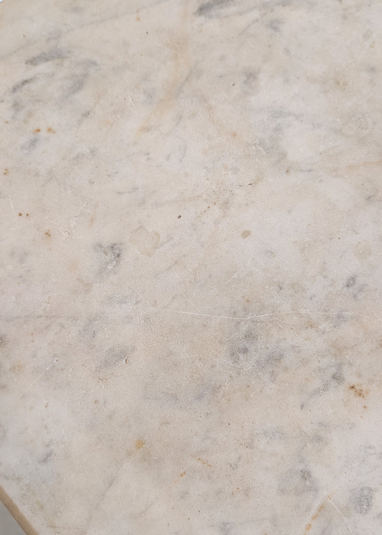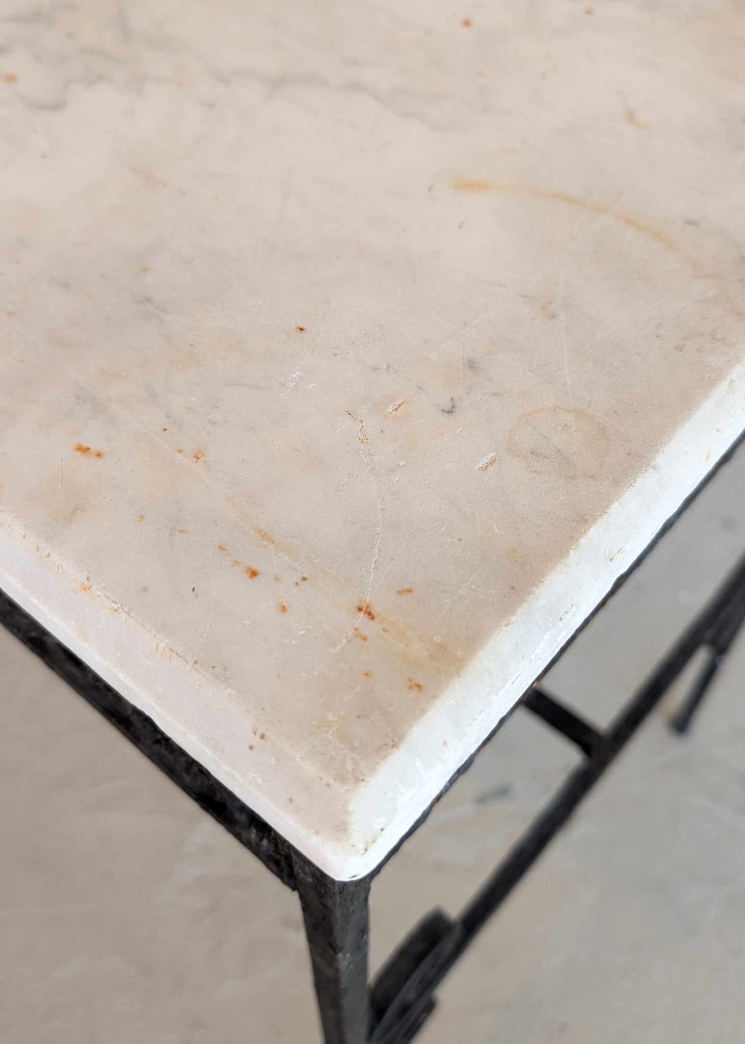 As shown in photos, there is age-appropriate wear throughout to include staining and chips on the marble top as well as some rusting and peeling of the finish to the wrought iron base. We view these as patina adding to the character of this piece.