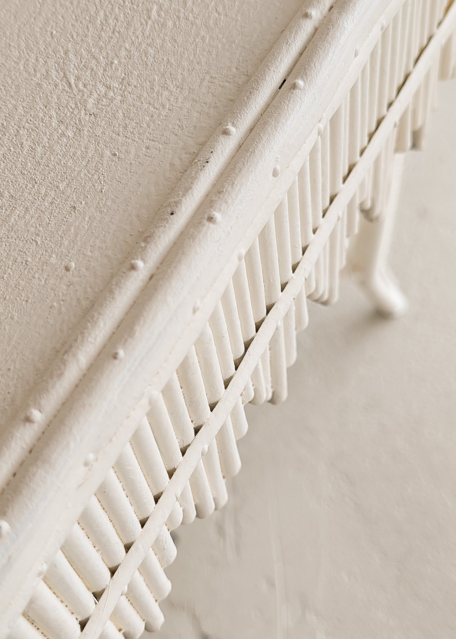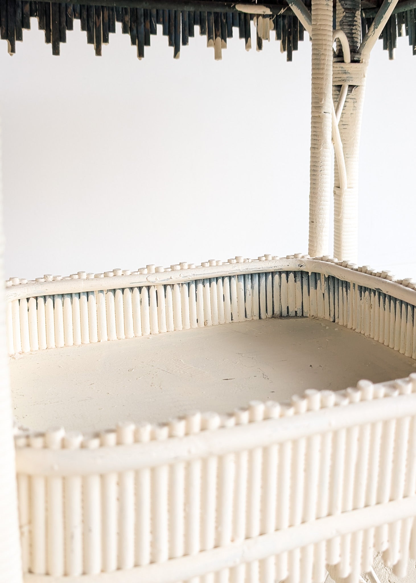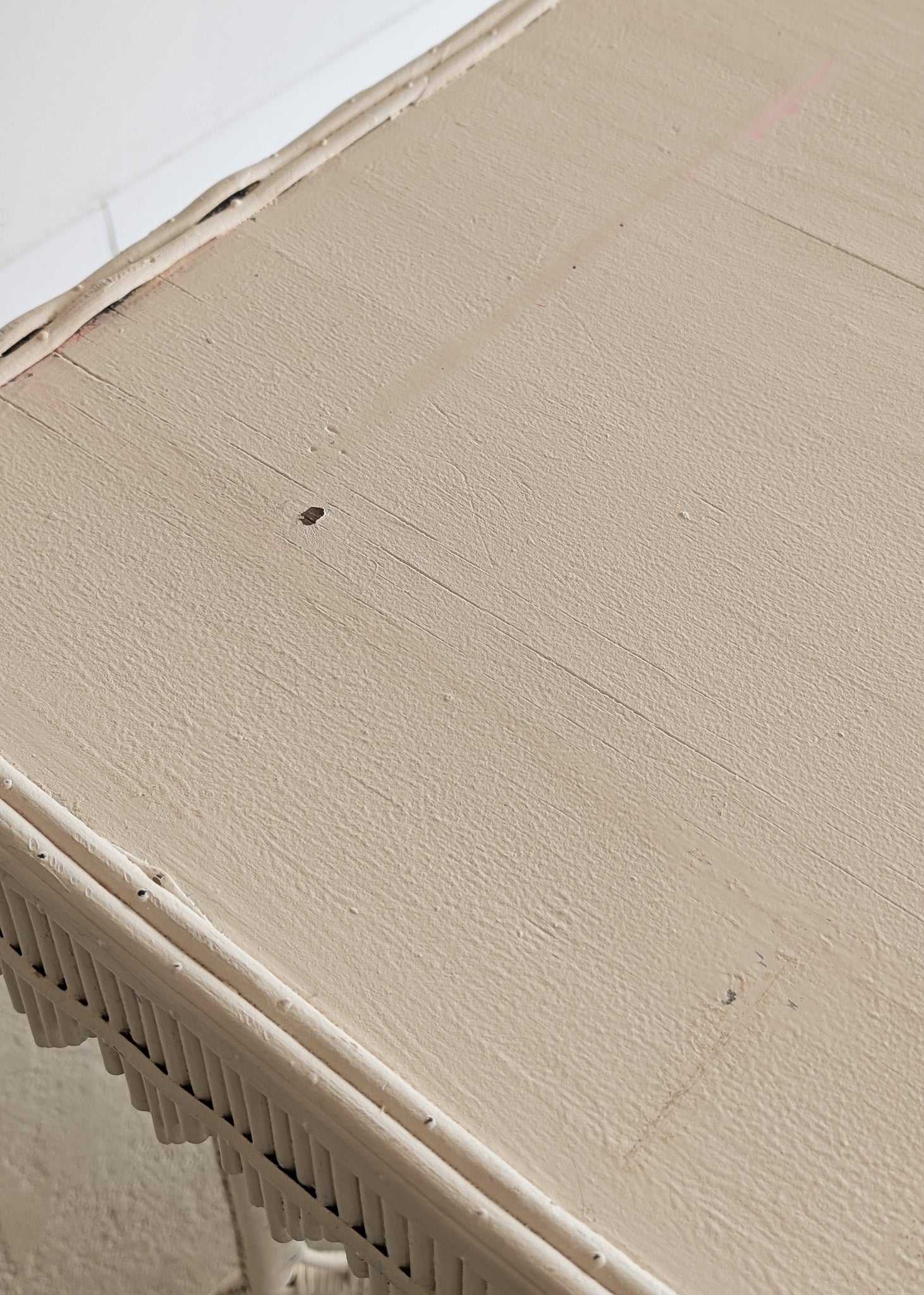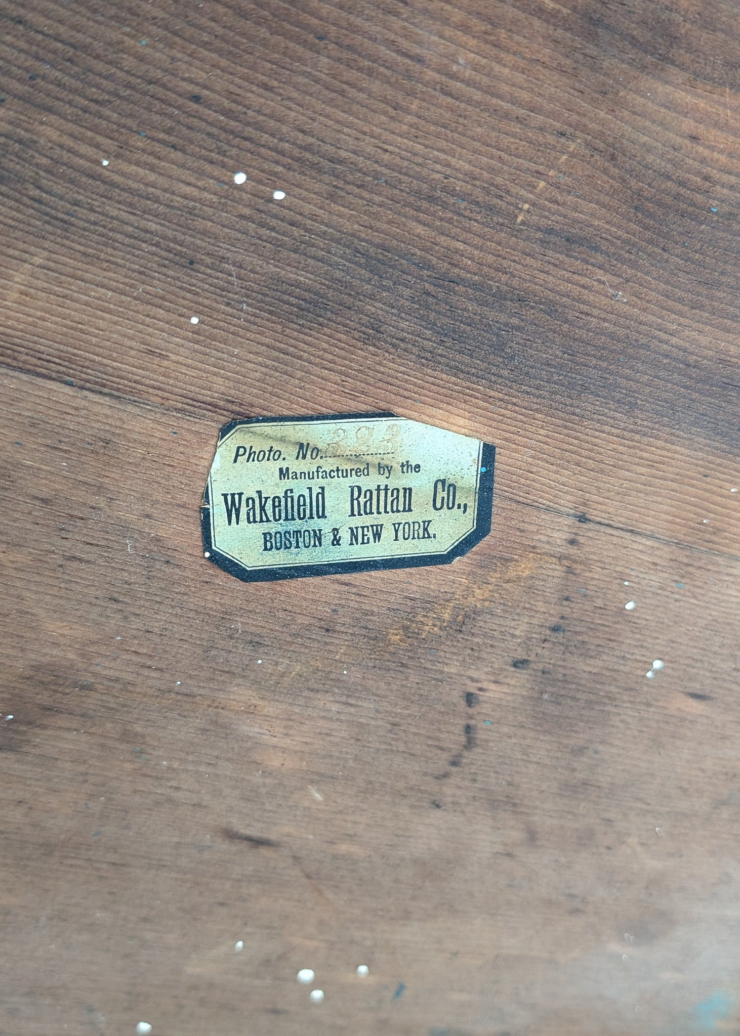 Crafted by Wakefield Rattan Company before they merged with Heywood Brothers in 1897 to create the now iconic Heywood-Wakefield, our antique Wakefield Rattan Company white painted rattan and wicker table adds textural interest to your home. Now painted a creamy, warm white, hints of an earlier dark teal peek through as subtle reminders of this table's story.