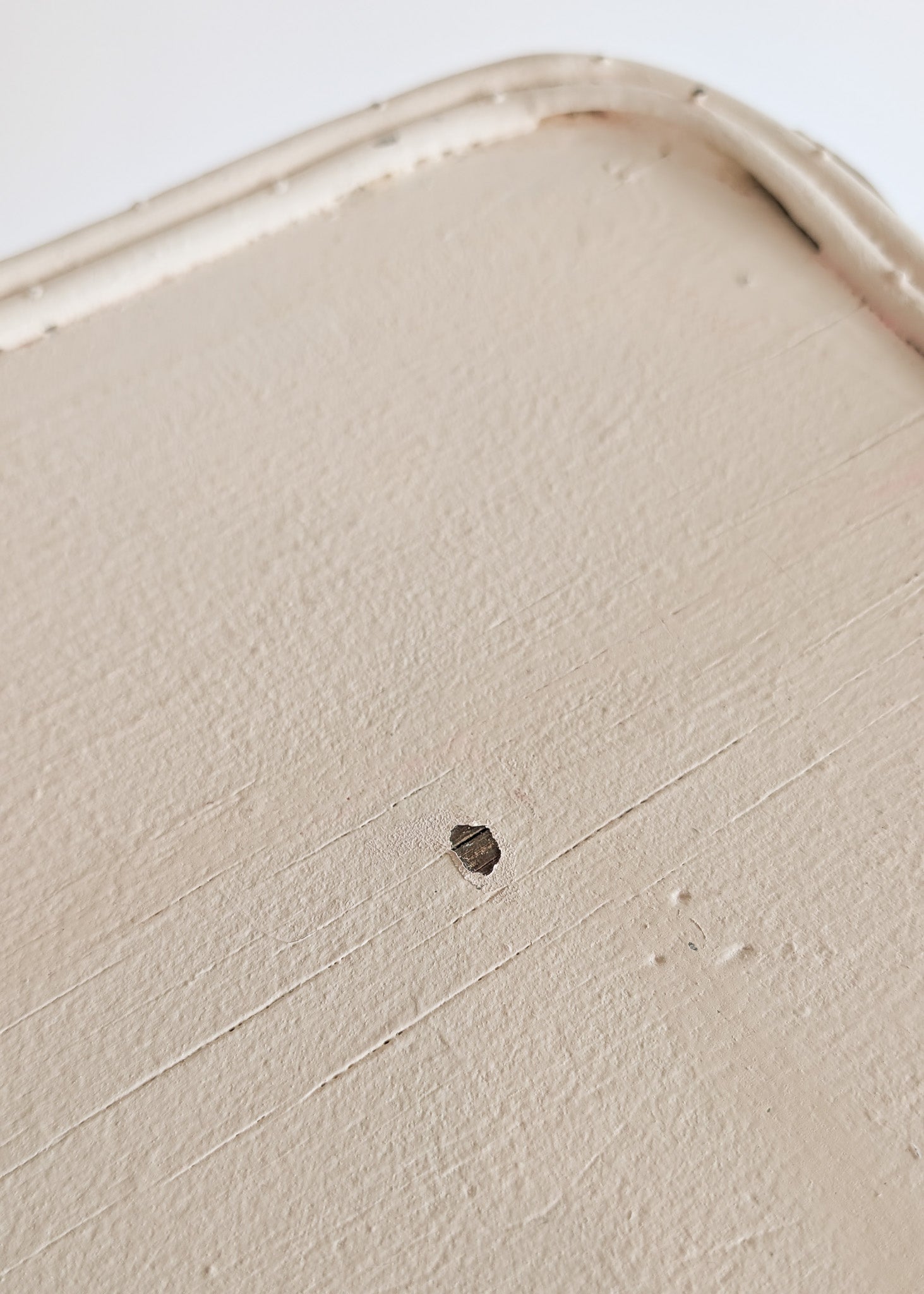 As shown in photos, there is light age-appropriate wear throughout, to include one small break to a piece of rattan along the table's apron. There is also a light pink stain as well as some spots of old adhesive on the top.
