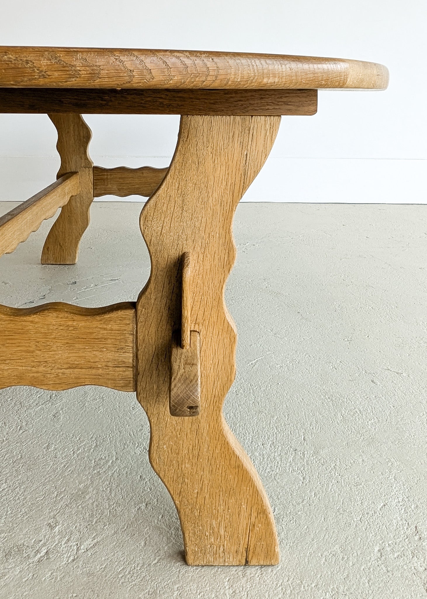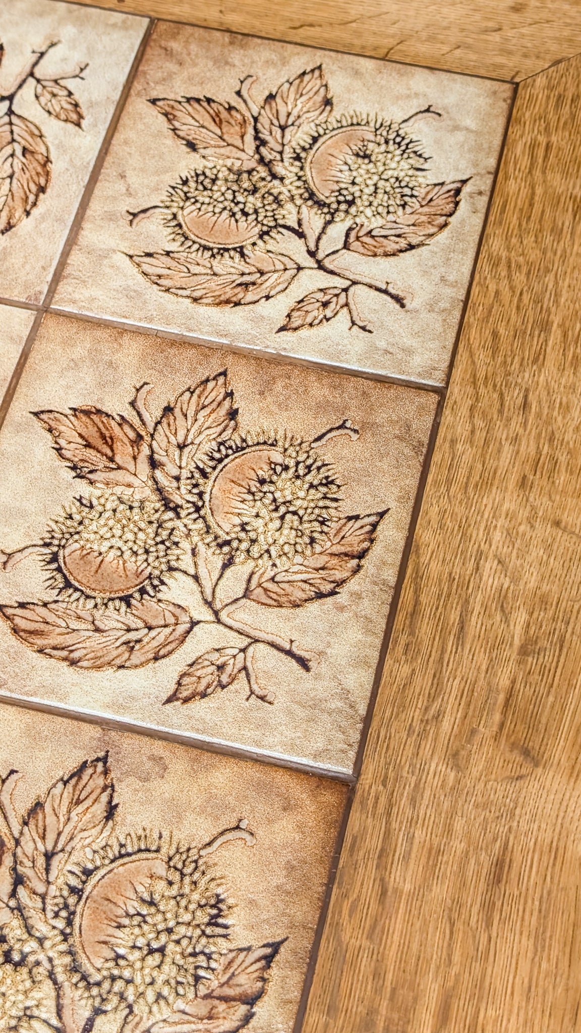 The perfect size to host family game nights or hold all your movie night snacks and drinks, our large vintage Danish Poul H. Poulsen-style quartersawn white oak and ceramic tile coffee table will become an instantly loved piece in your home. Warm, neutral colors, sweet chestnut detailing on the tiled top and scalloped stringers make this coffee table both charming and approachable.