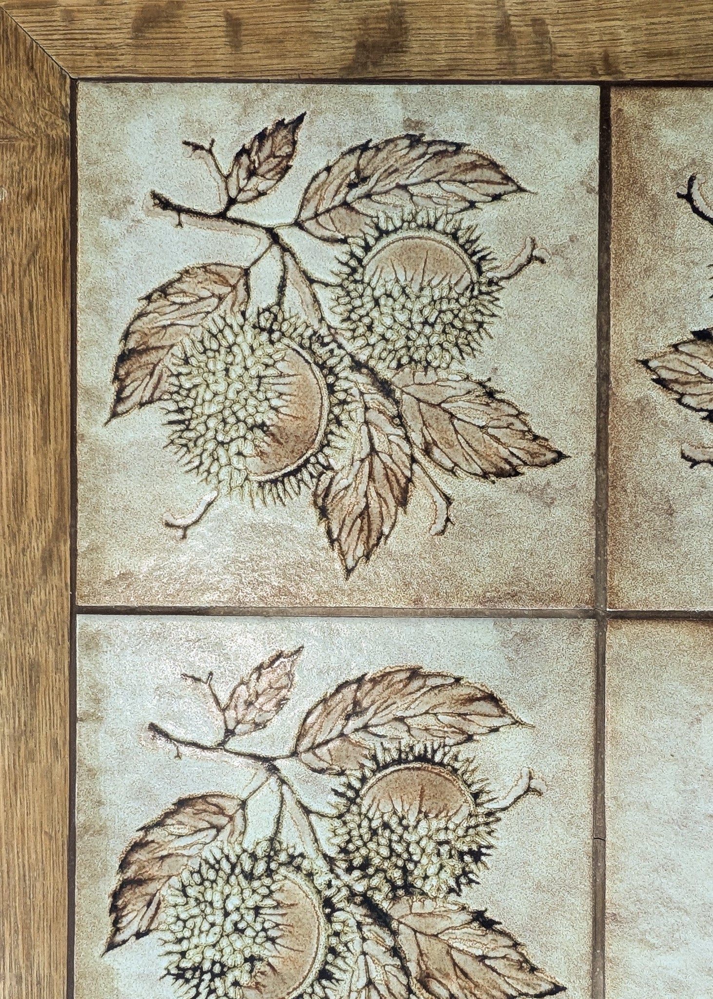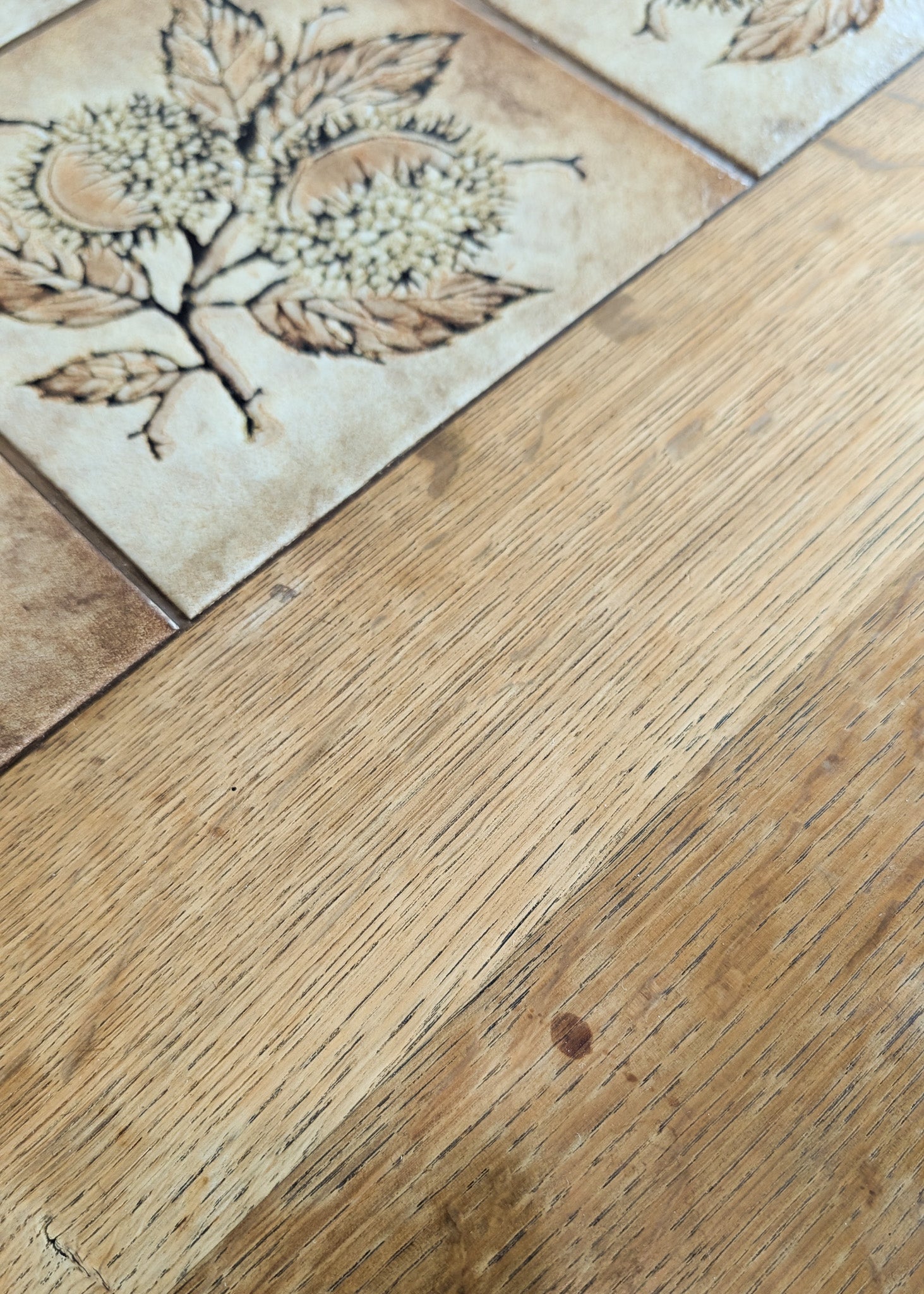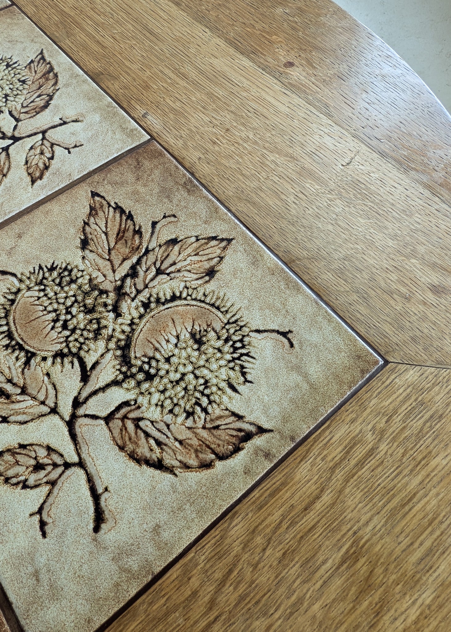 As shown in photos, there is age-appropriate wear throughout. There are some small cracks to the grout lines as well as a completely stable, old repair near the top side of a leg.