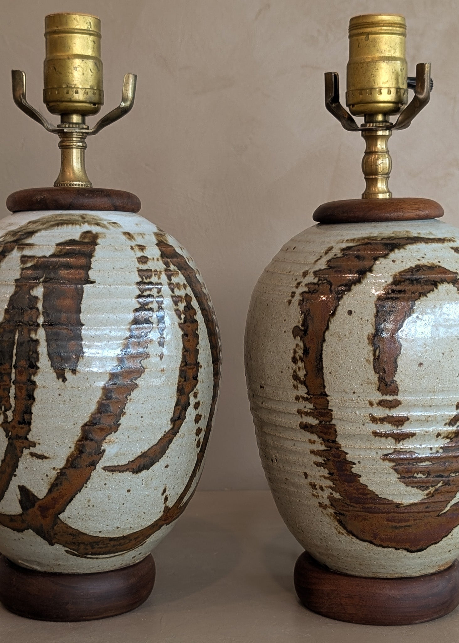 Pair of Vintage Neutral Studio Pottery and Teak Wood Lamps with Freeform Detailing