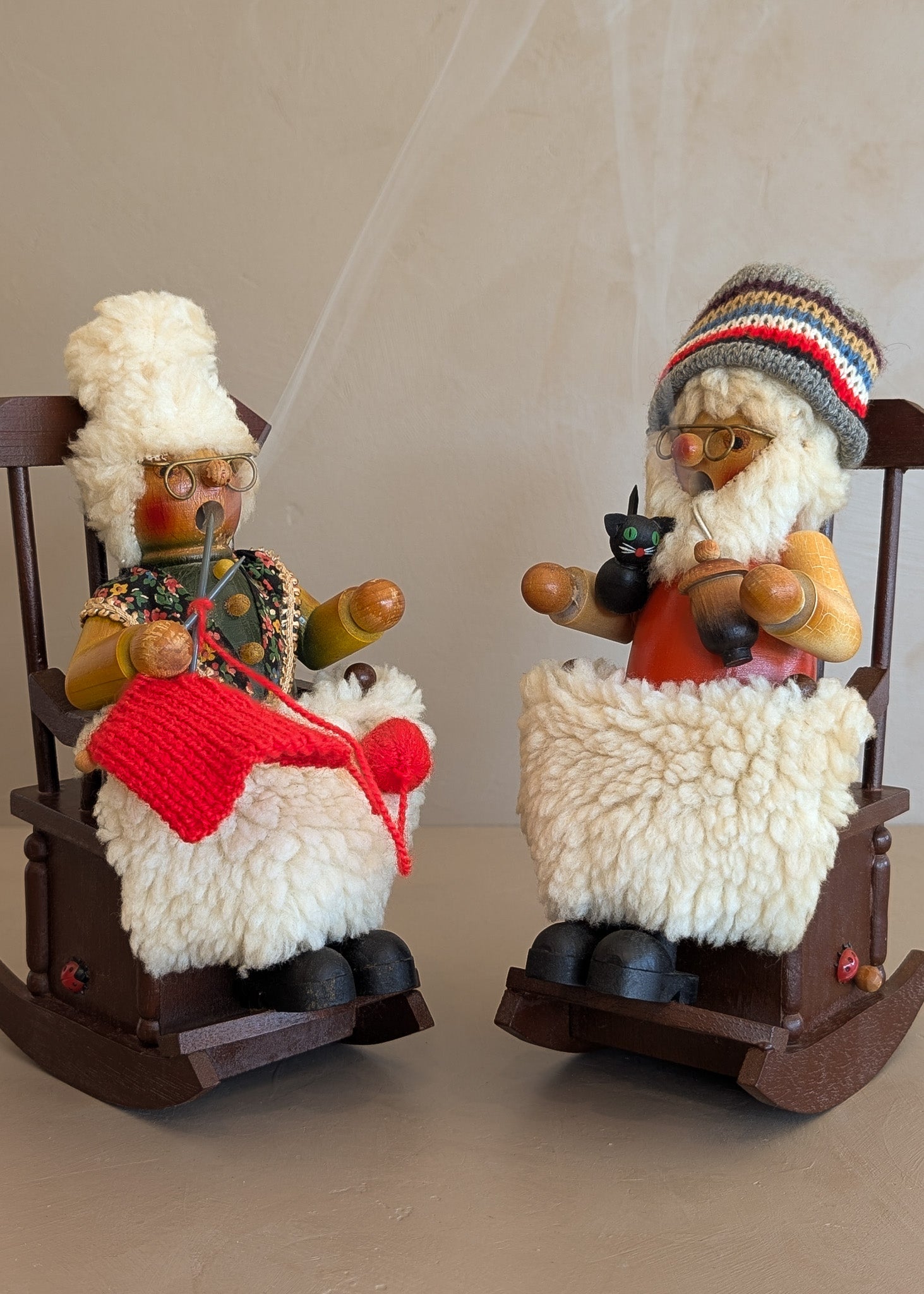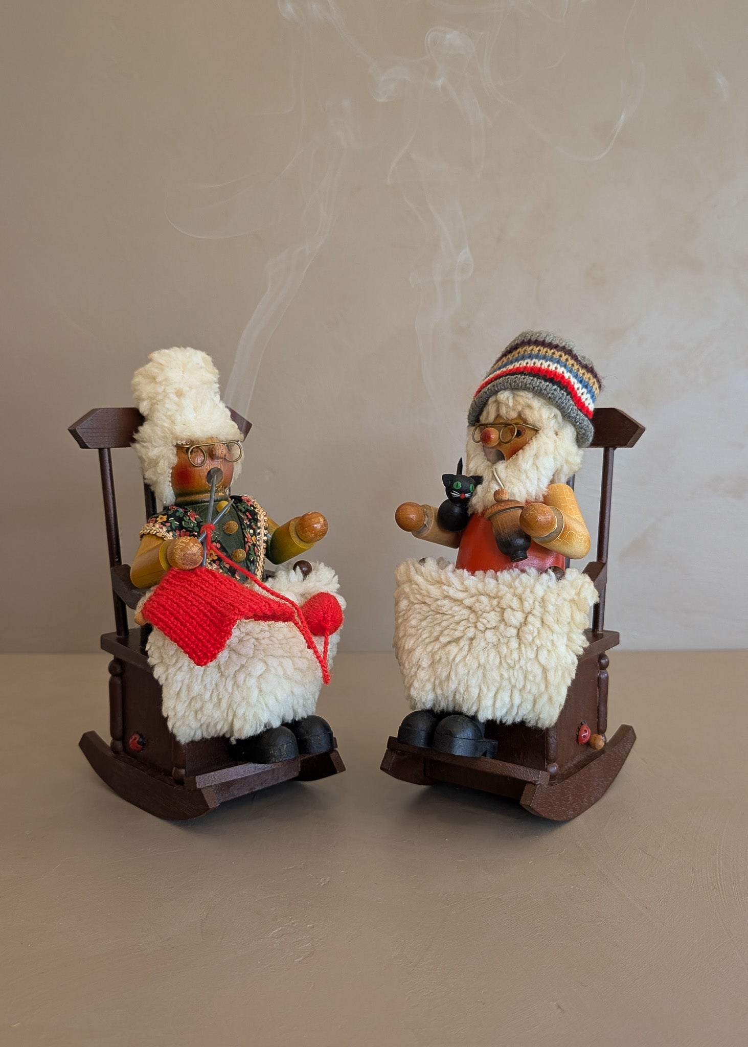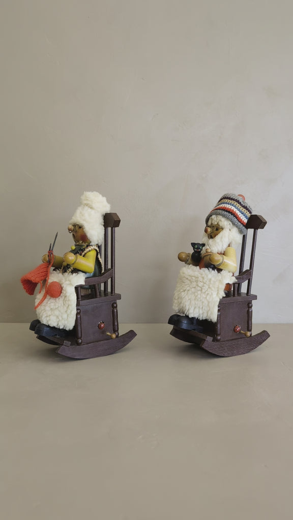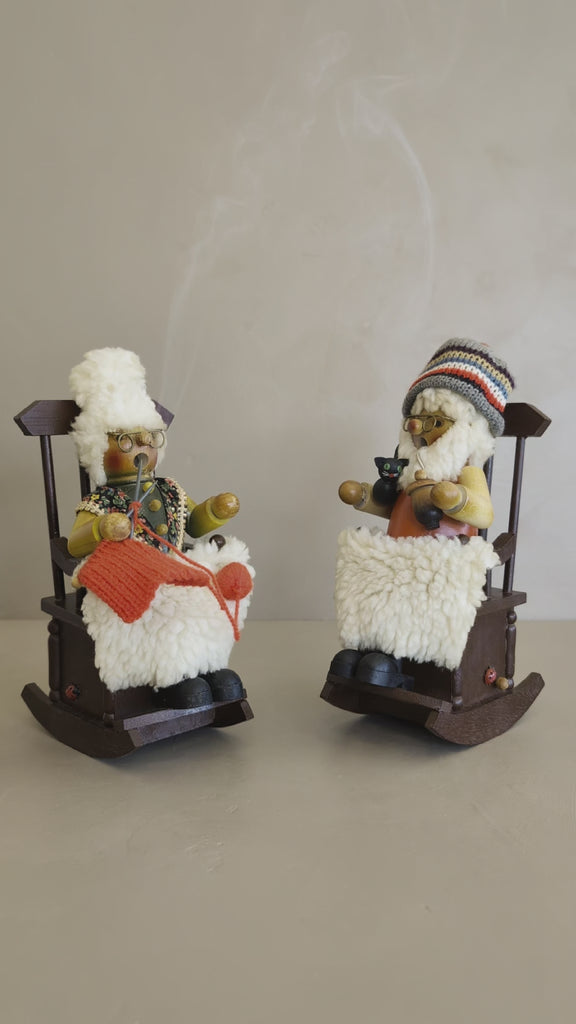 Wonderfully nostalgic and perfectly charming, our pair of vintage rocking music box Steinbach German Knitting Grandma and Grandpa with Black Cat smokers is a delightful addition to your holiday decor. Captivating for adults and children alike, these smokers are sure to become a treasure that everyone looks forward to year after year. We love these as the start of (or addition to) a family tradition or as an unexpected gift for the vintage Christmas lover in your life.