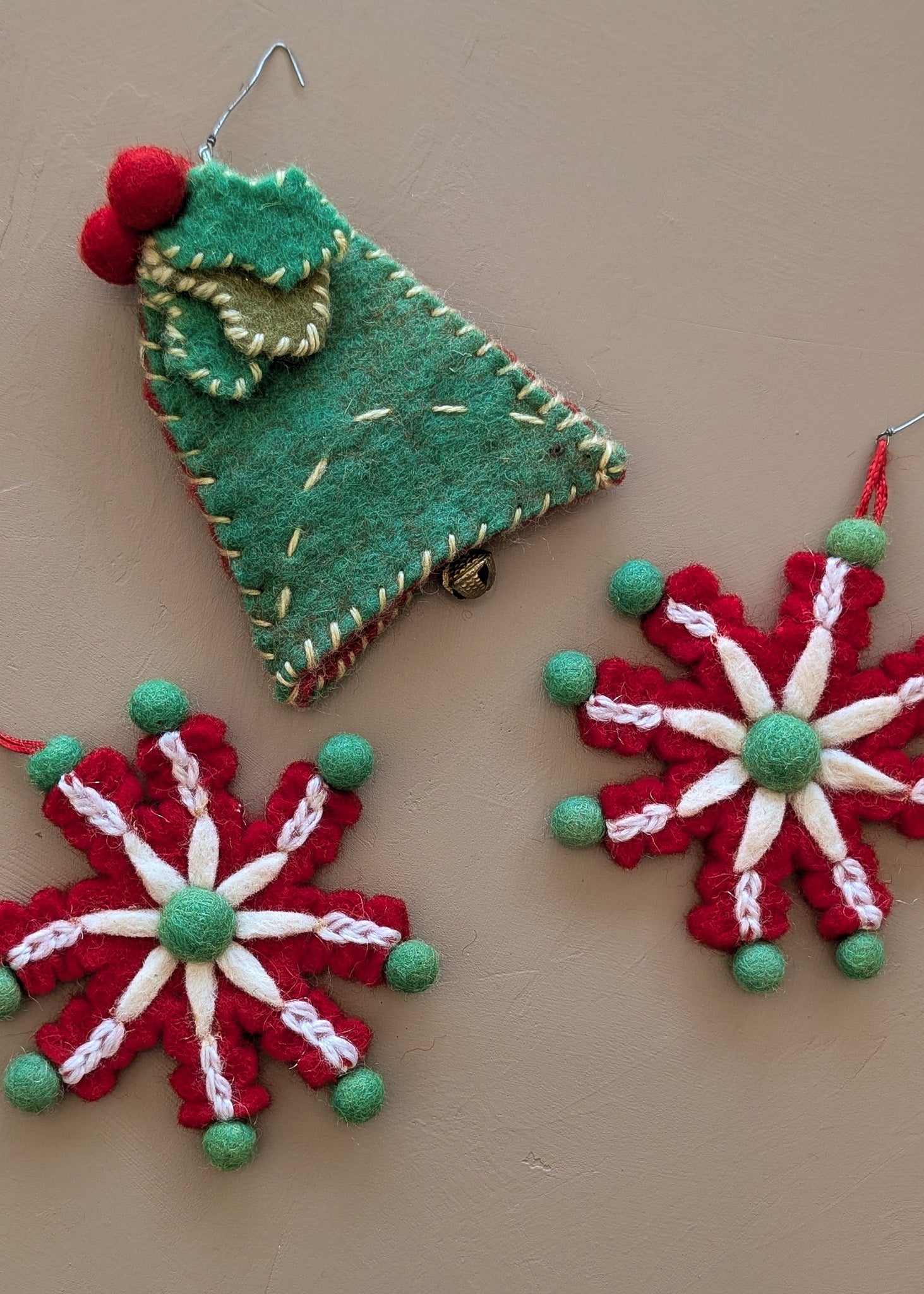 Set of 3 Vintage Felted Wool Snowflakes and Bell Christmas Holiday Ornaments