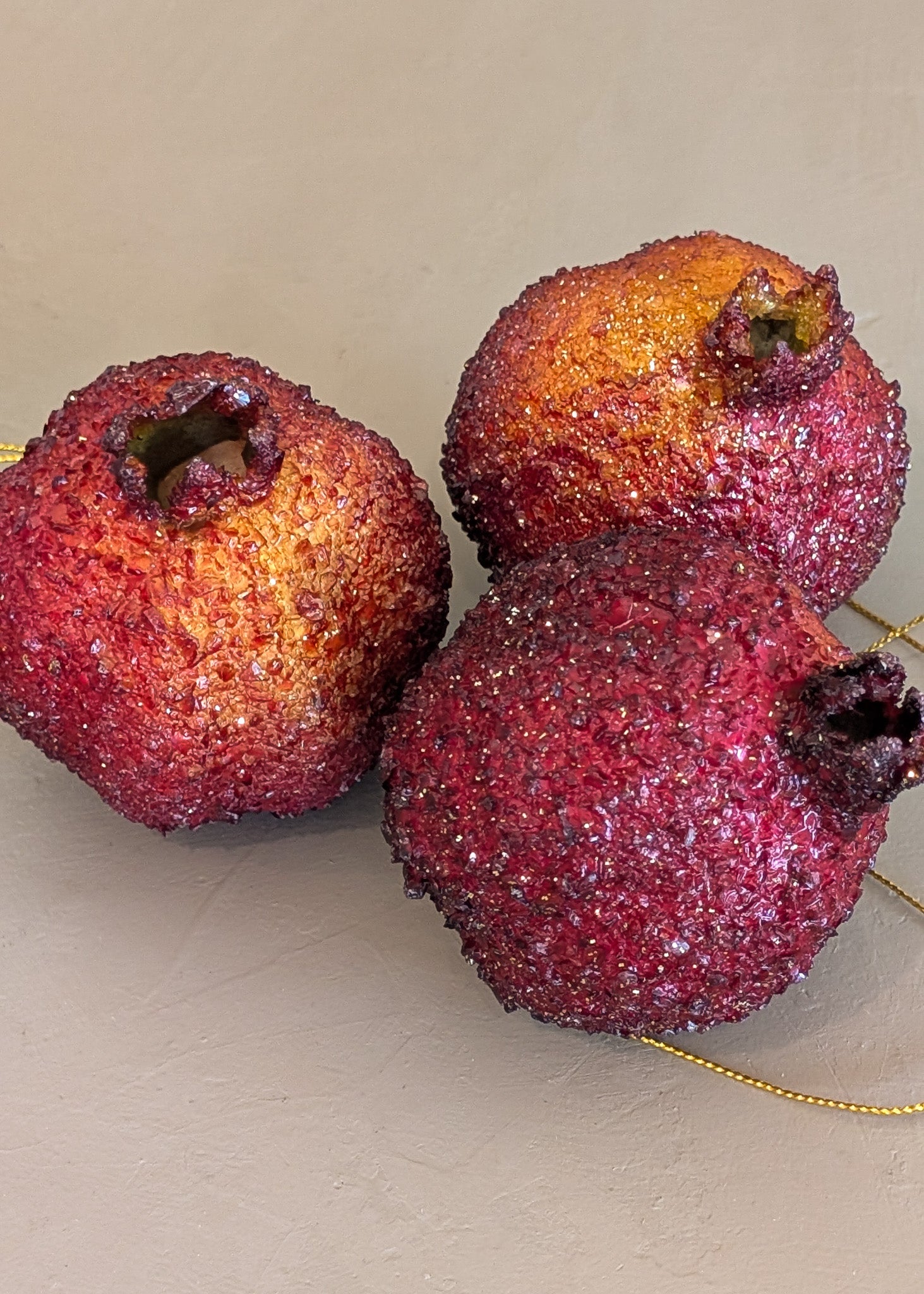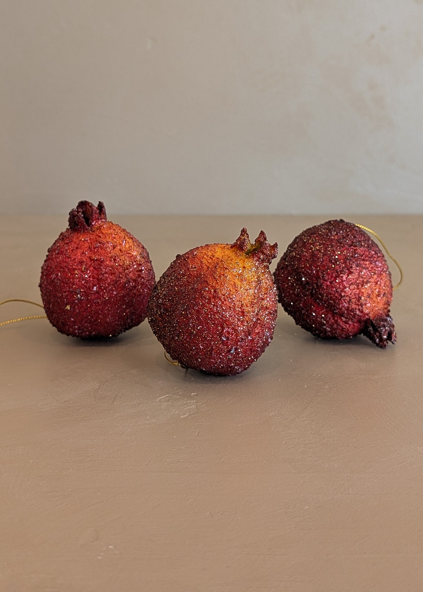 With beautiful red and orange tones, our set of 3 vintage glitter sugared pomegranates ornaments is a perfect addition to your holiday decor. We love these as a special statement on a Christmas tree, added to a bowl as decor or even hung on fluffy, mixed green garland.