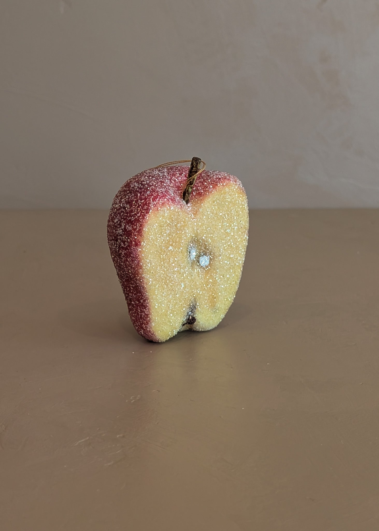 Sparkly and charming, our vintage glitter sugared cut apple ornament is a perfect addition to your holiday decor. We love this as a special statement on a Christmas tree, an unexpected gift topper or even hung on fluffy, mixed greenery garland.